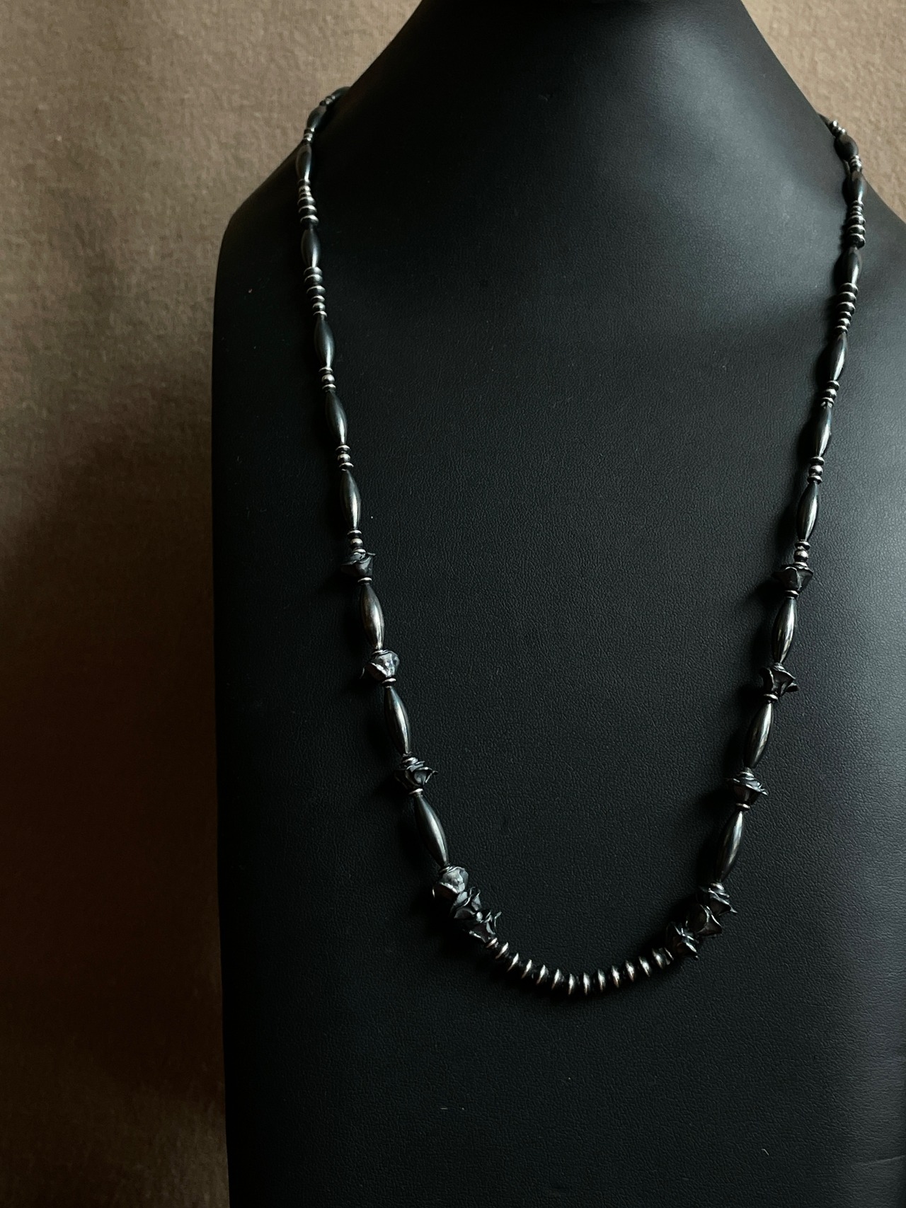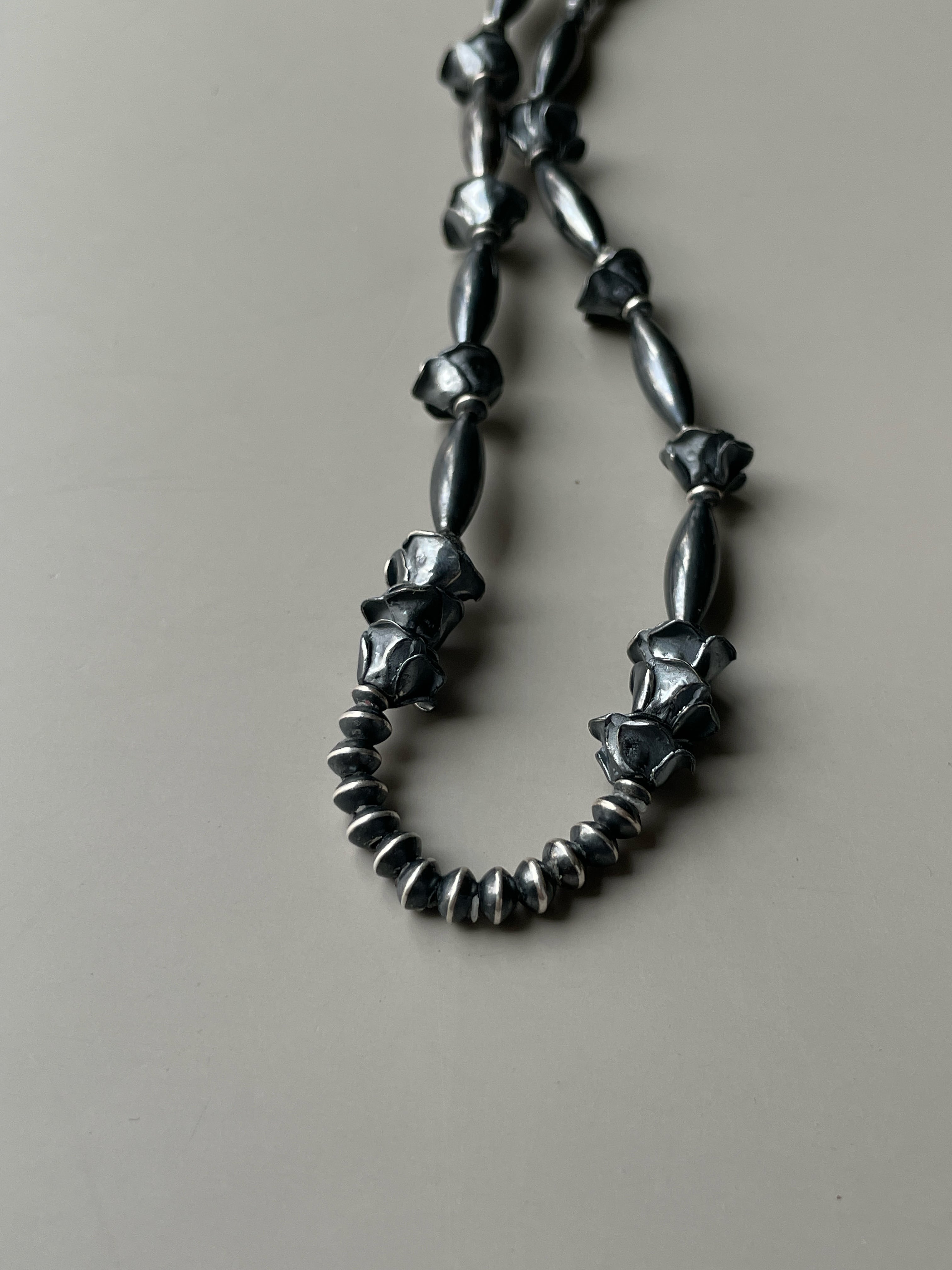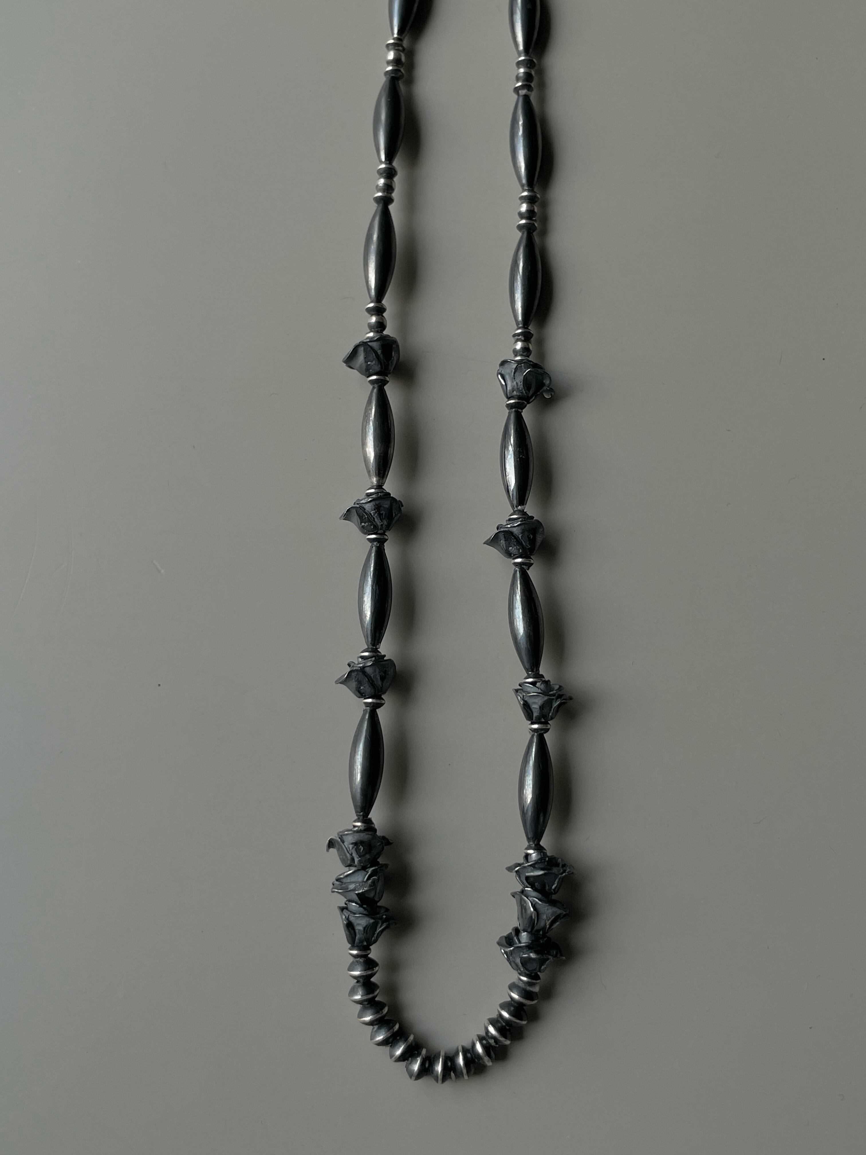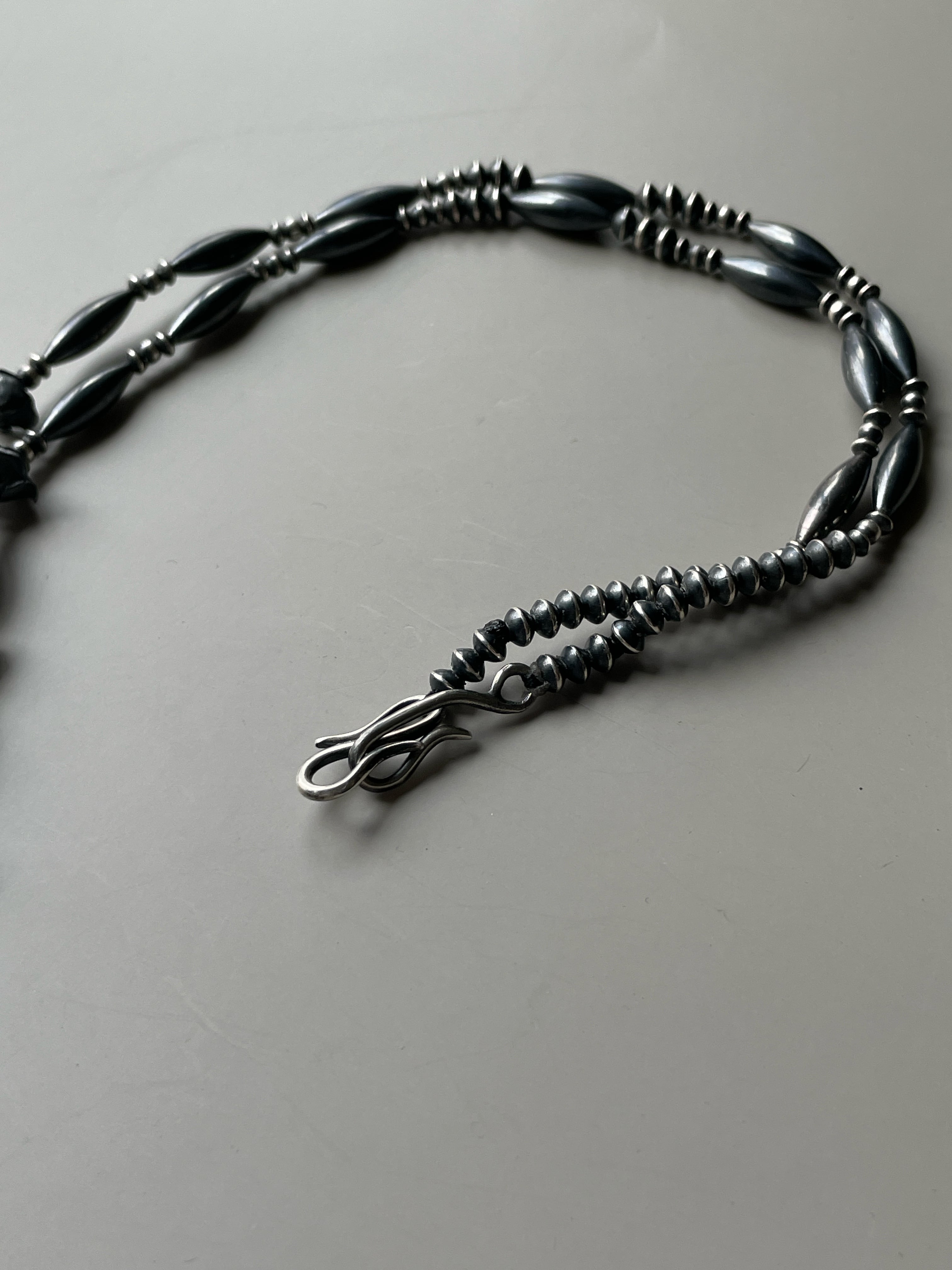 シルバービーズを自ら燻し1つ1つ磨きあげるSTAYTHAM original black perl necklace。